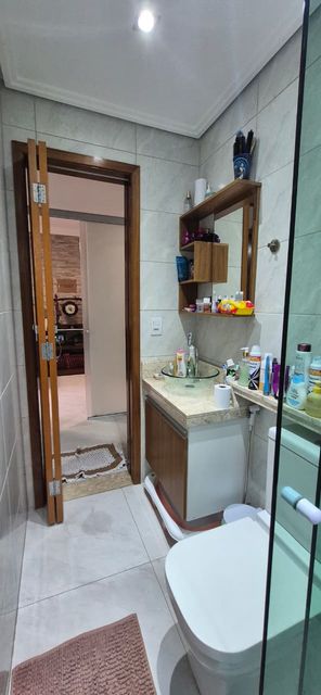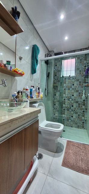 Banheiro moderno com box blindex e armário embutido