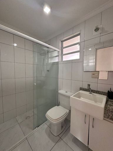 O banheiro, já equipado com box de vidro, reflete o cuidado com cada detalhe.