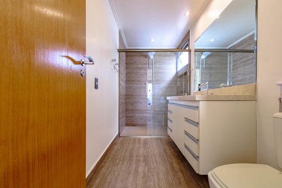 Na área íntima, são 4 suítes, todas espaçosas, com destaque para a suíte master, que conta com closet e armários planejados, oferecendo conforto e funcionalidade.