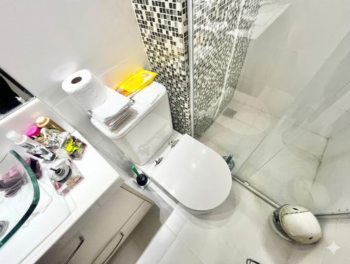 Banheiro Completo: Com box instalado e gabinete.