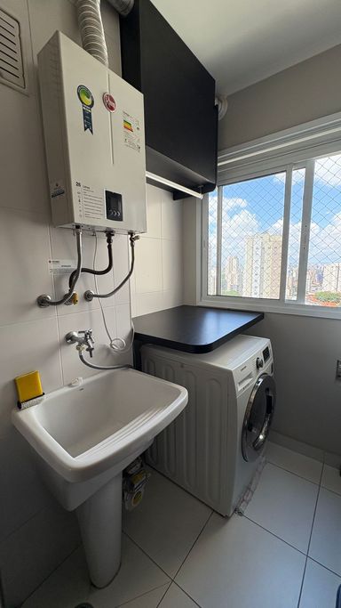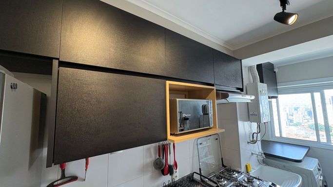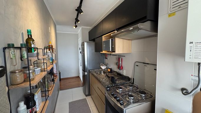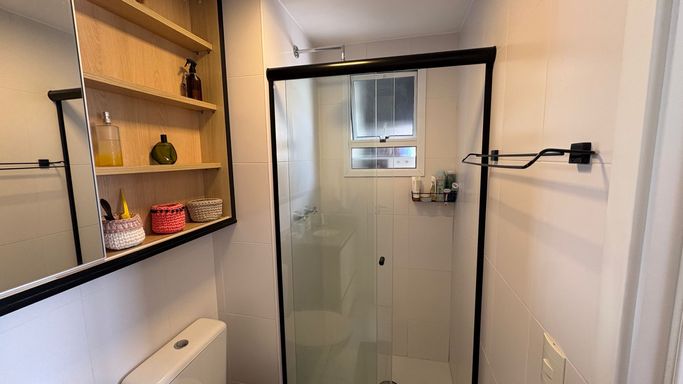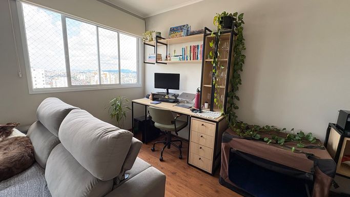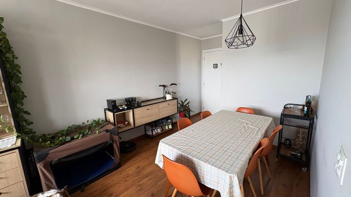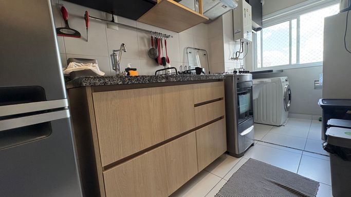 Conta ainda com banheiro social, cozinha independente com armários planejados e área de serviço com ventilação natural e ótima iluminação. Os ambientes são bem cuidados, com piso frio nas áreas molhadas e piso laminado nos demais espaços.