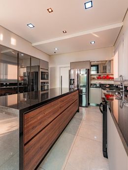 A cozinha é ampla e funcional, equipada com móveis planejados, torre com forno e micro-ondas, além de forno gourmet — ideal para quem valoriza praticidade e bom gosto. O imóvel permanece com sofás e mesa de jantar, agregando ainda mais valor.